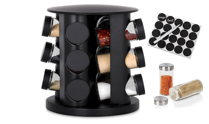 - Porta tempero giratório para cozinha com 12 potes, oferecendo organização e praticidade