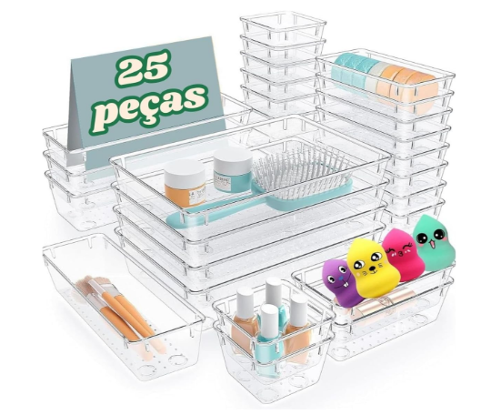 5️⃣ House Organizer Kit 25 Peças Conjunto De Organizadores De Gavetas De Plástico Transparente.